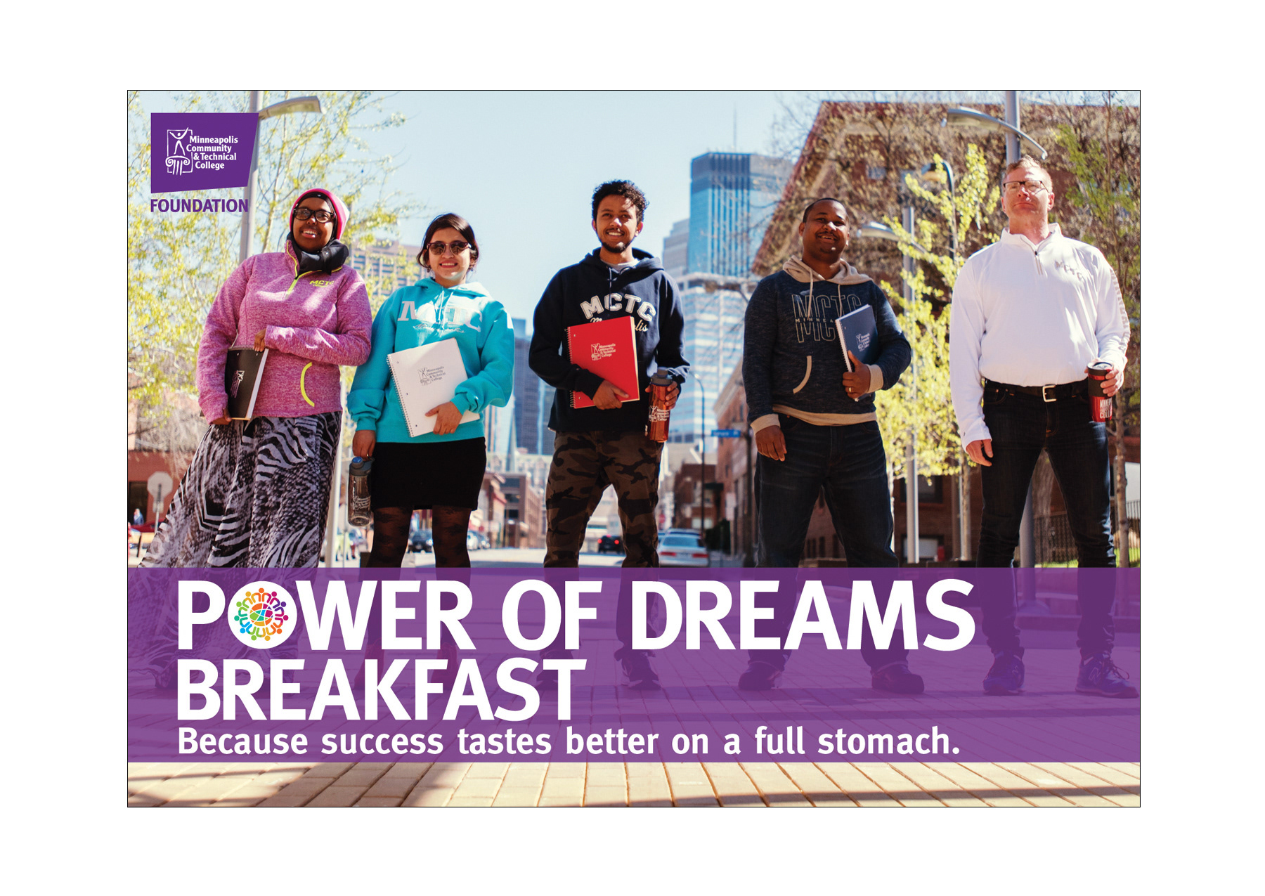 Power of Dreams Breakfast is an event held by the MCTC Foundation to honor and celebrate scholar students and their donors. This postcard was created to send out to donors, businesses, and the Minneapolis neighborhood about the upcoming event.