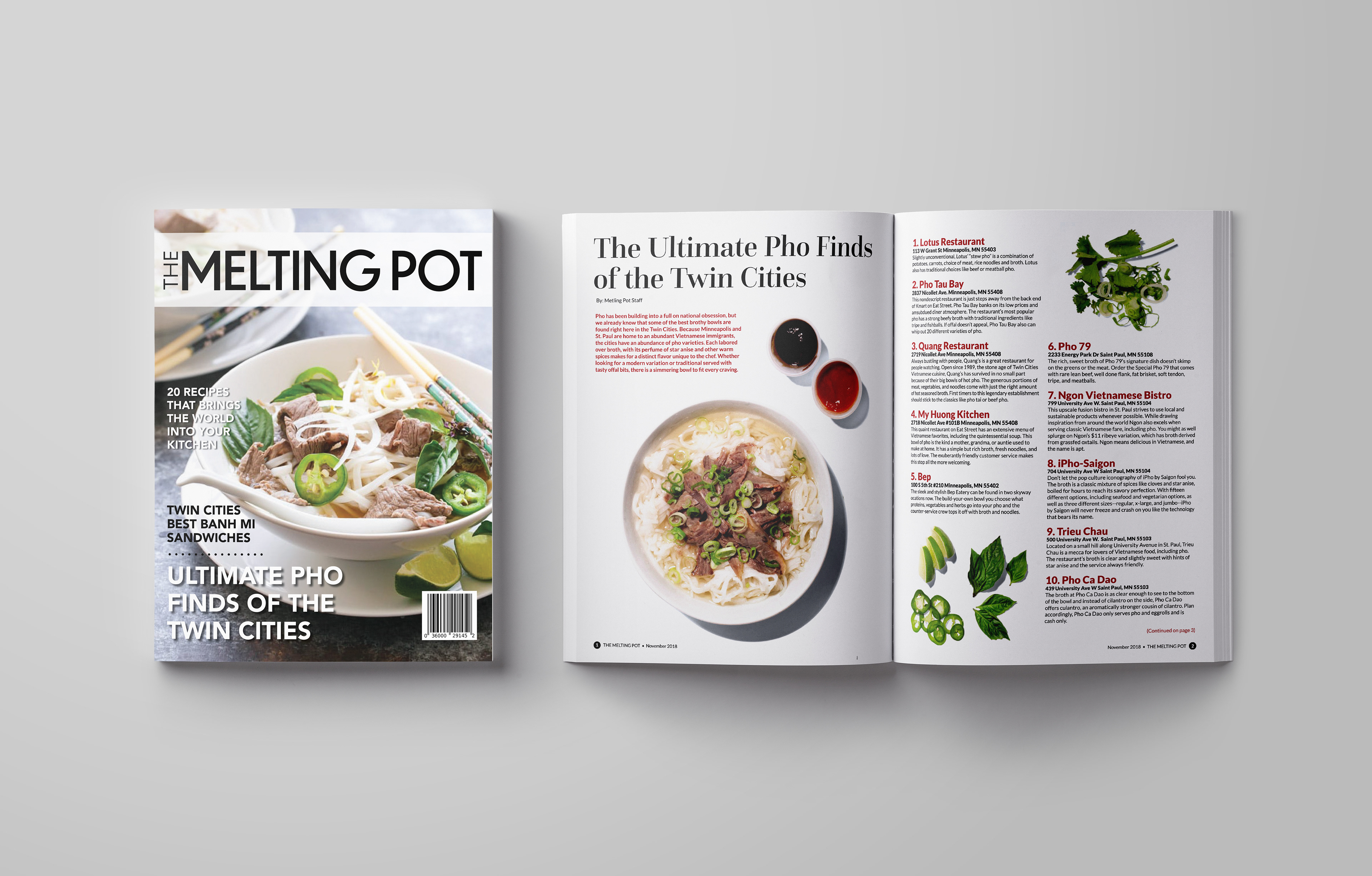 The Melting Pot is was an editorial assignment for Graphic Design Problems 1. It's a local magazine highlighting and celebrating the diversity of the Twin Cities through food and culture.